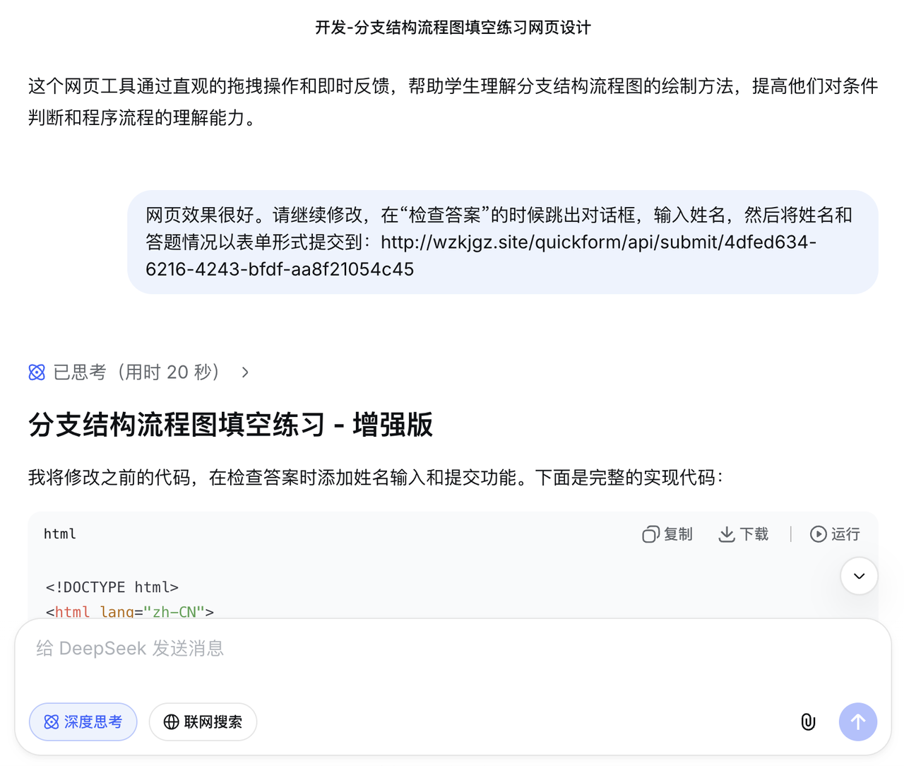 大模型会自动在网页中嵌入数据提交功能。学生完成操作后,数据将通过接口自动存储至您的 QuickForm 账户。