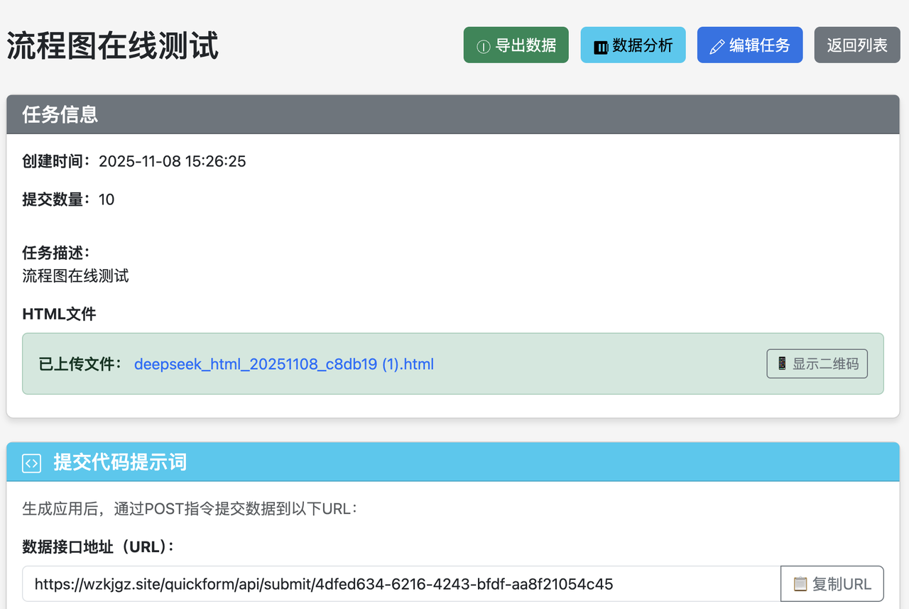 继续使用您熟悉的大模型(如 DeepSeek、GPT 等)生成交互网页,只需在提示词中加入一句: “请将数据以表单形式提交至(您的 QuickForm 数据接口地址)。”